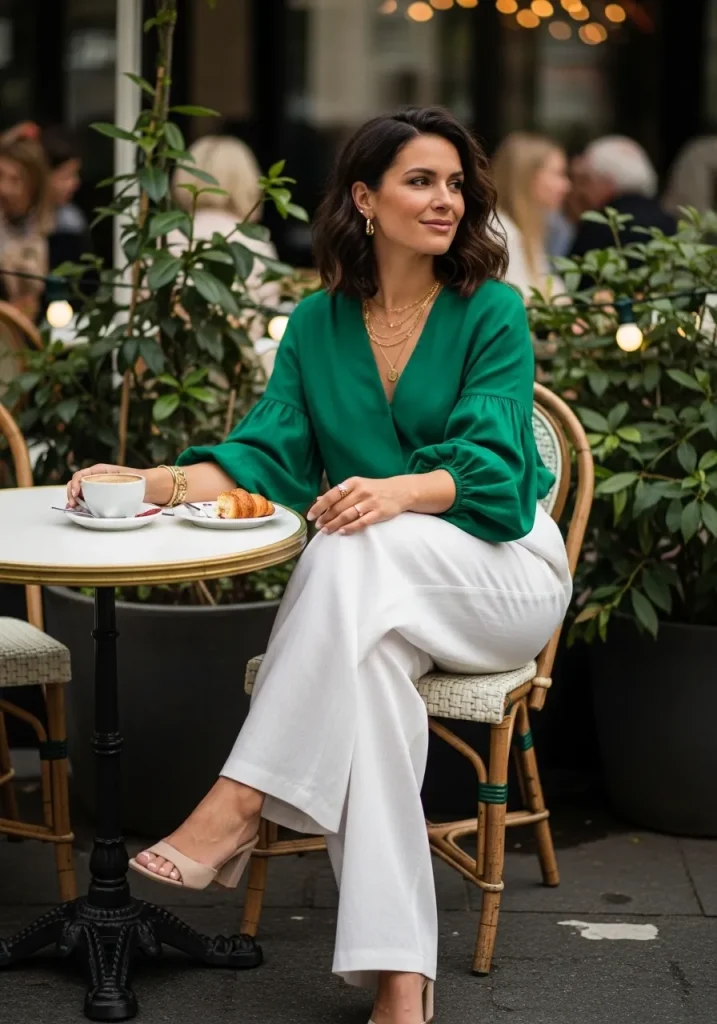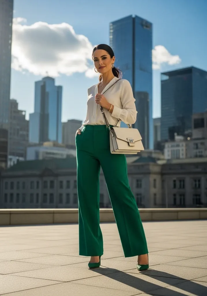 Emerald wide-leg trousers paired with a crisp white blouse create a sophisticated Emerald Green Outfit that feels both modern and timeless. The tailored pants make a bold statement while the neutral top keeps the overall look balanced. This combination is ideal for professional settings, lunches, or more formal St Patrick’s Day gatherings.