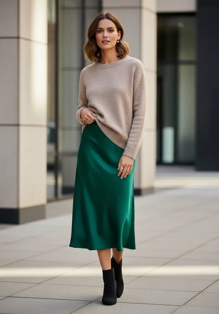 11. Green Slip Skirt with Neutral Sweater
