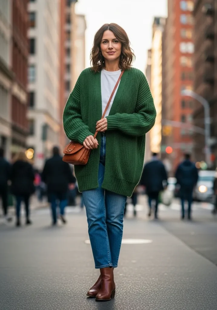 12. Oversized Green Cardigan with Basics