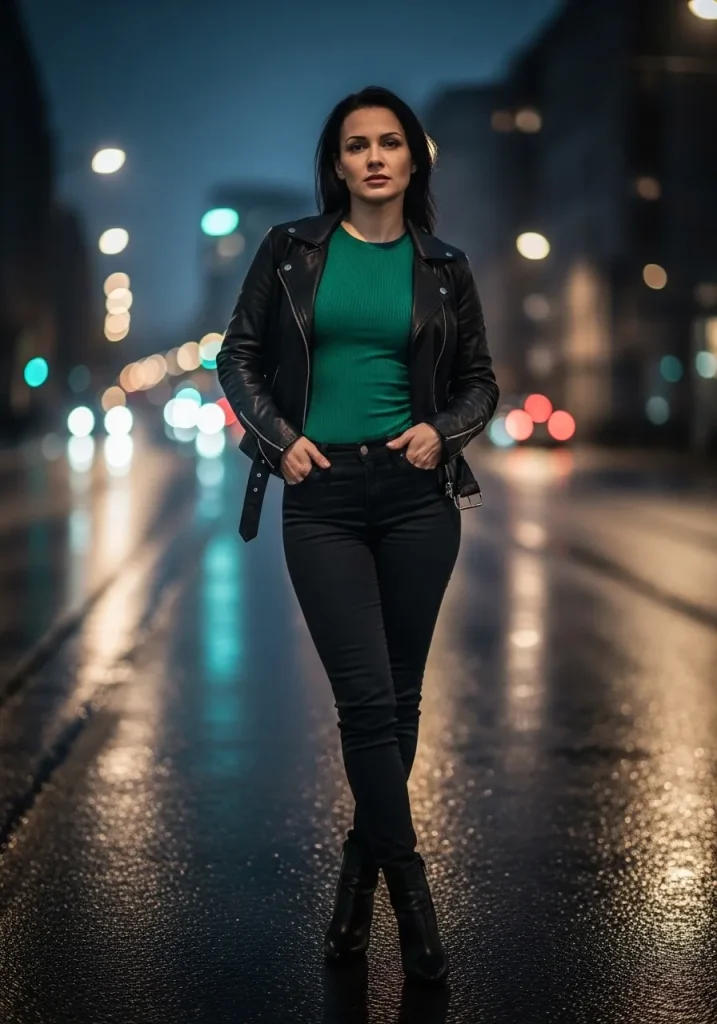 For an edgier take on St Patricks Outfit styling, pair a fitted green top with a classic leather jacket. The contrast between soft color and tough outerwear creates a balanced look that feels modern and confident. This is an excellent Trendy St Patricks Day Outfit for evening plans, concerts, or nightlife celebrations.