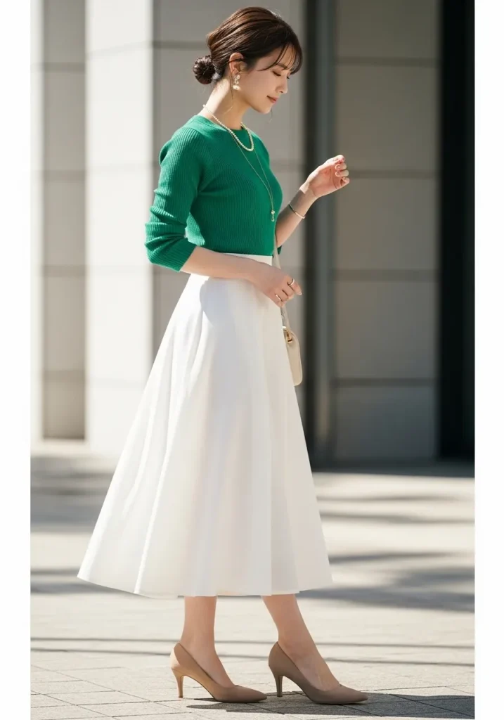 16. Green Knit Top with White Midi Skirt