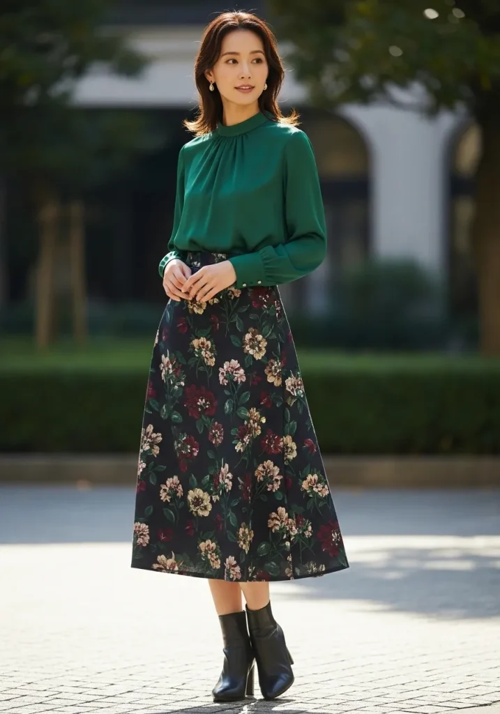19. Green Blouse with Dark Floral Skirt