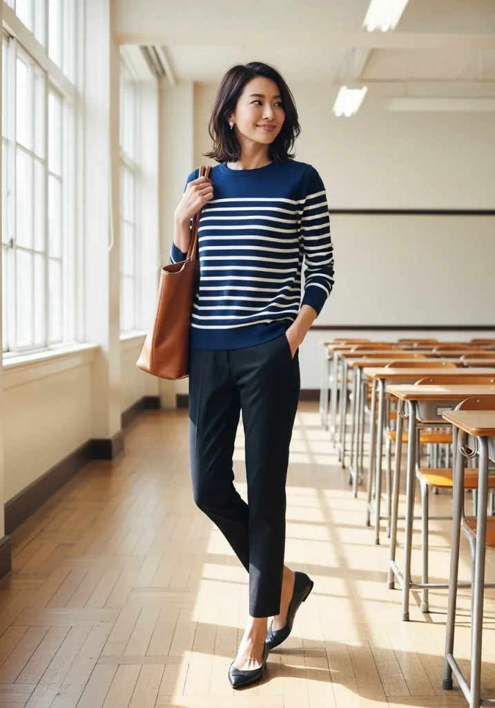 A striped sweater paired with ankle-length pants creates a relaxed yet polished classroom outfit that feels stylish without trying too hard. The stripes add subtle visual interest while keeping the overall look classic and timeless.