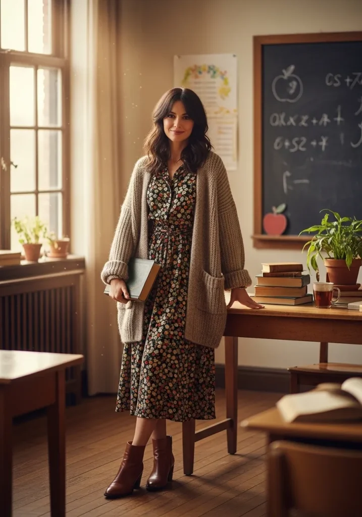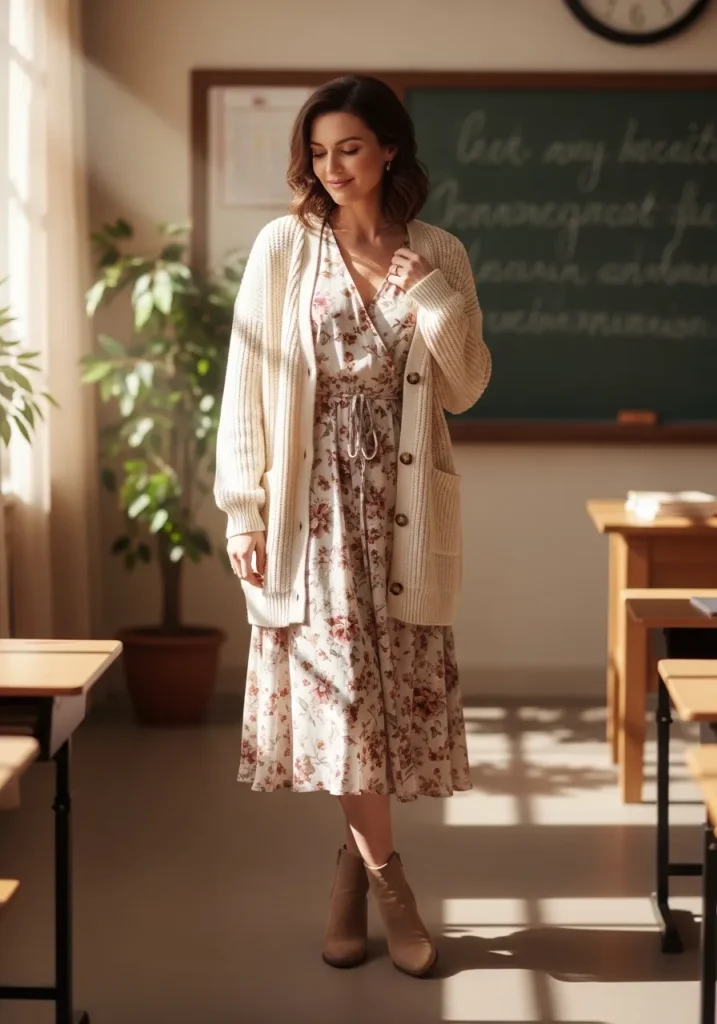 Choose floral dresses with soft color palettes like blush, sage green, or pastel blue for a gentle and elegant aesthetic. A neutral cardigan in cream or oatmeal helps balance the pattern and adds warmth during cooler classroom hours. Pair the outfit with ankle boots or ballet flats to keep the look comfortable while still feeling polished and classroom appropriate.