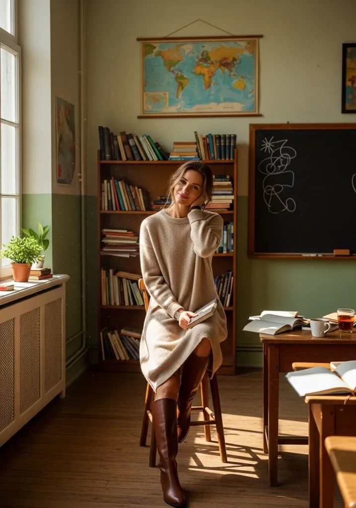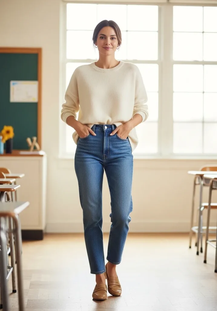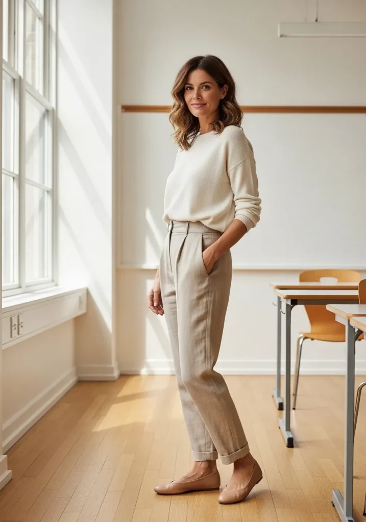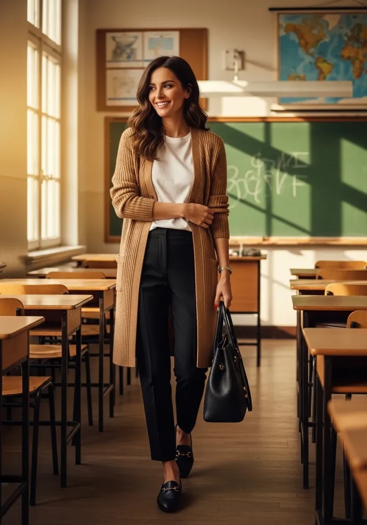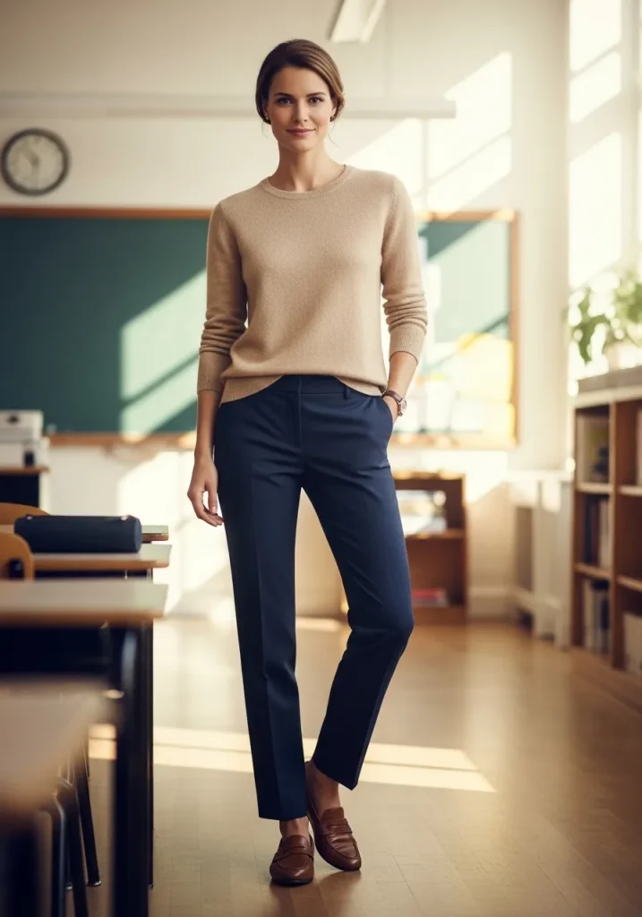 Choose sweaters in neutral shades like soft beige, light gray, or dusty blue to keep the outfit versatile and easy to style. Tailored trousers in classic colors like black, navy, or camel create a flattering silhouette that looks clean and structured. Finish the outfit with loafers or pointed-toe flats and add a simple tote bag to carry classroom essentials while maintaining a stylish, put-together appearance.