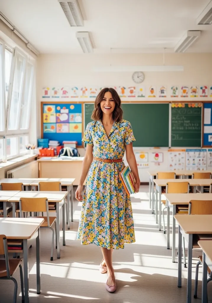 Floral prints, subtle polka dots, or geometric patterns are perfect for maintaining a stylish yet classroom-appropriate aesthetic. Choosing stretch fabrics in the skirt makes the outfit more comfortable for sitting, walking, and teaching. Pair with flats or low block heels to keep the outfit practical.
