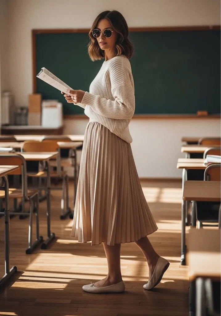 Light-colored shirts such as white, pale blue, or soft stripes pair beautifully with midi-length pleated skirts in shades like navy, camel, or dusty rose. Slightly tucking the shirt into the skirt helps define the waist and creates a balanced silhouette. Complete the outfit with ballet flats or loafers for a refined classroom look that feels effortlessly chic.
