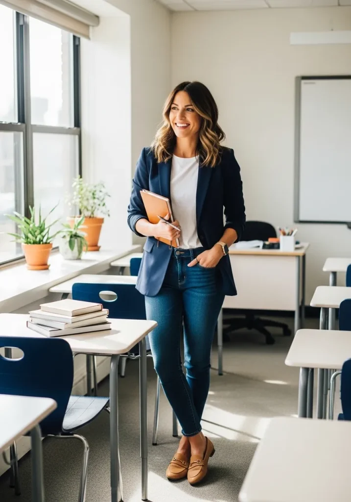 Pairing a structured blazer with dark jeans creates a polished smart-casual teacher outfit that works beautifully for everyday classroom style. The blazer elevates the denim, making the entire look feel professional while still maintaining comfort.