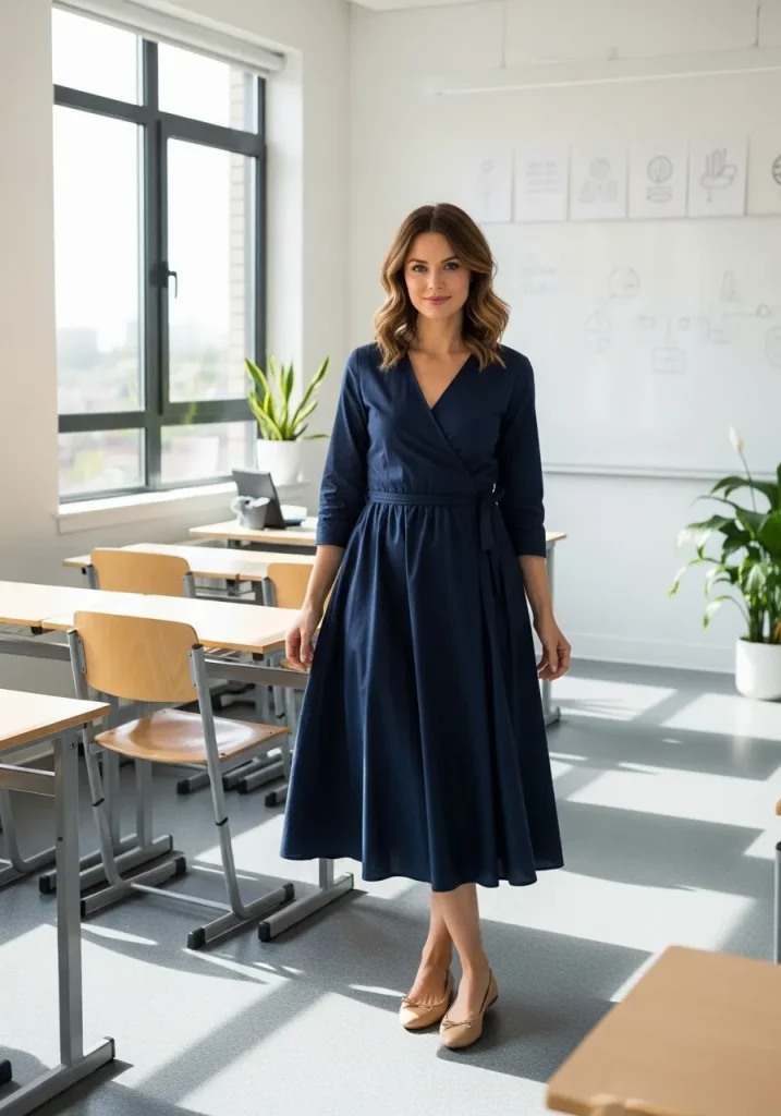 A wrap dress is one of the most flattering and practical outfits for teachers because it creates a complete look with minimal effort. The wrap silhouette naturally defines the waist and creates a feminine shape while still allowing comfortable movement throughout the day.