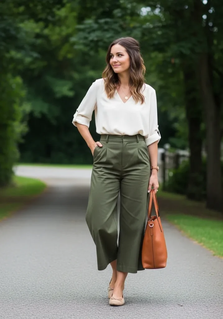 Wide-leg trousers are a favorite for teachers because they combine comfort with a modern, polished look. When paired with a lightweight blouse, this outfit feels professional yet relaxed enough for long teaching days.