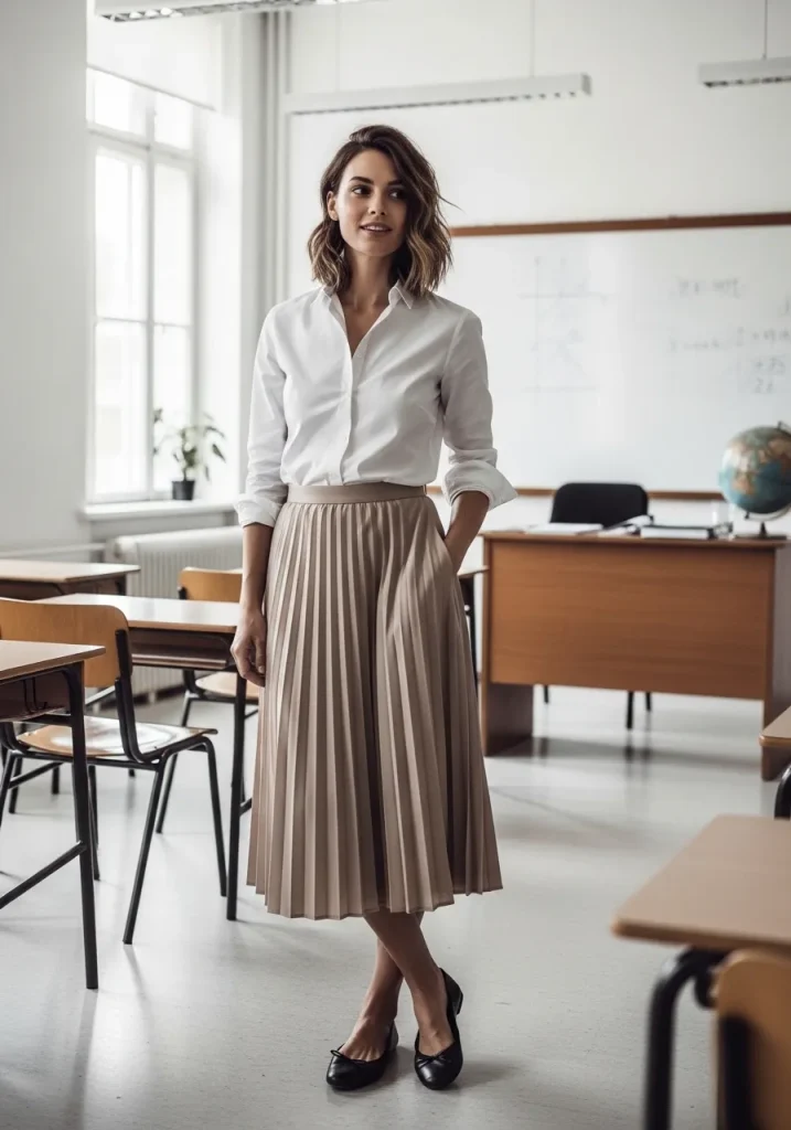 A crisp button-up shirt paired with a pleated skirt creates a classic teacher outfit that feels both polished and stylish. The structured shirt adds a professional touch, while the pleated skirt introduces movement and elegance. This combination is perfect for teachers who want a sophisticated look that still feels comfortable throughout the day.