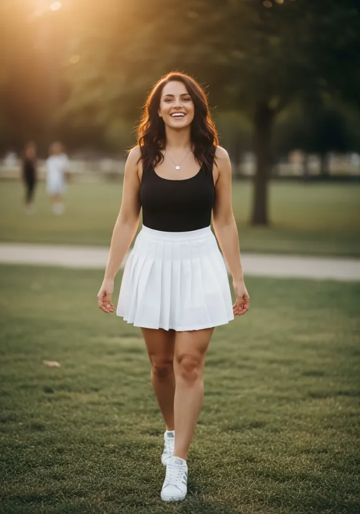 A classic white tennis skirt paired with a fitted tank top is the ultimate clean and sporty look. The structured pleats of the skirt add movement while the fitted tank keeps the outfit balanced and flattering. This combination feels simple but instantly polished.