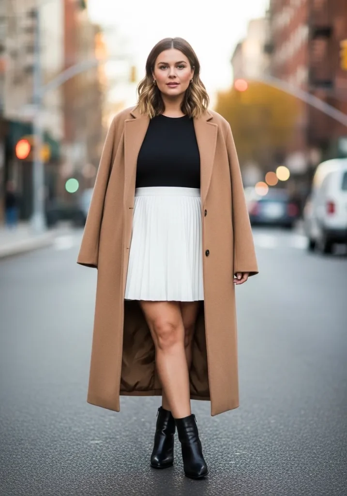 A tennis skirt paired with a long coat creates a chic layered outfit that blends sporty and sophisticated elements. The long coat adds structure and elegance while the skirt keeps the outfit youthful and fresh. This combination works beautifully for cooler seasons.