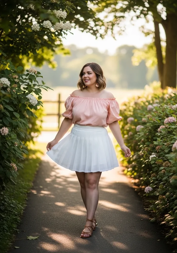 A tennis skirt with an off-shoulder top creates a soft and romantic outfit that highlights the neckline and shoulders beautifully. The off-shoulder detail adds a feminine touch while the skirt keeps the look light and playful.