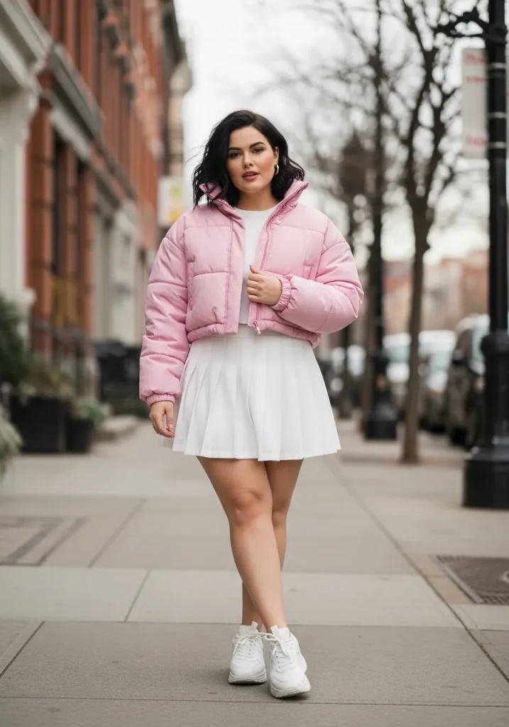 A tennis skirt paired with a puffer jacket creates a trendy street-style look that feels bold and practical. The puffer jacket adds volume and warmth while the skirt keeps the outfit youthful and fresh.