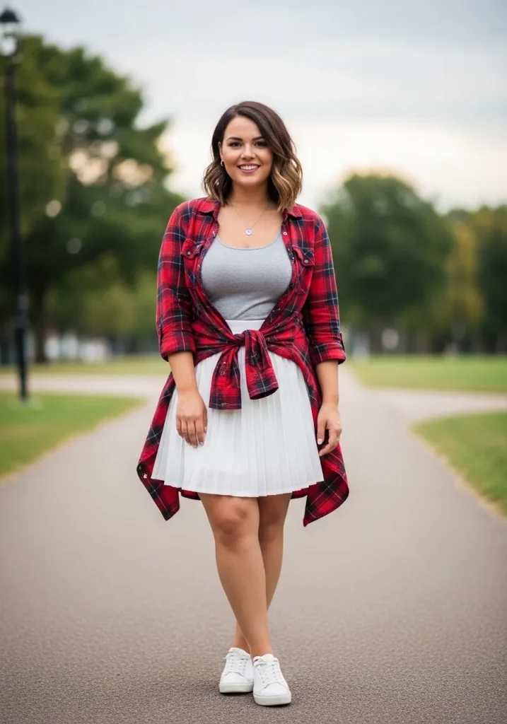 Layering a flannel shirt over a tank top with a tennis skirt creates a relaxed and slightly edgy outfit. The flannel adds texture and gives the outfit a casual, laid-back vibe while the skirt keeps it feminine.