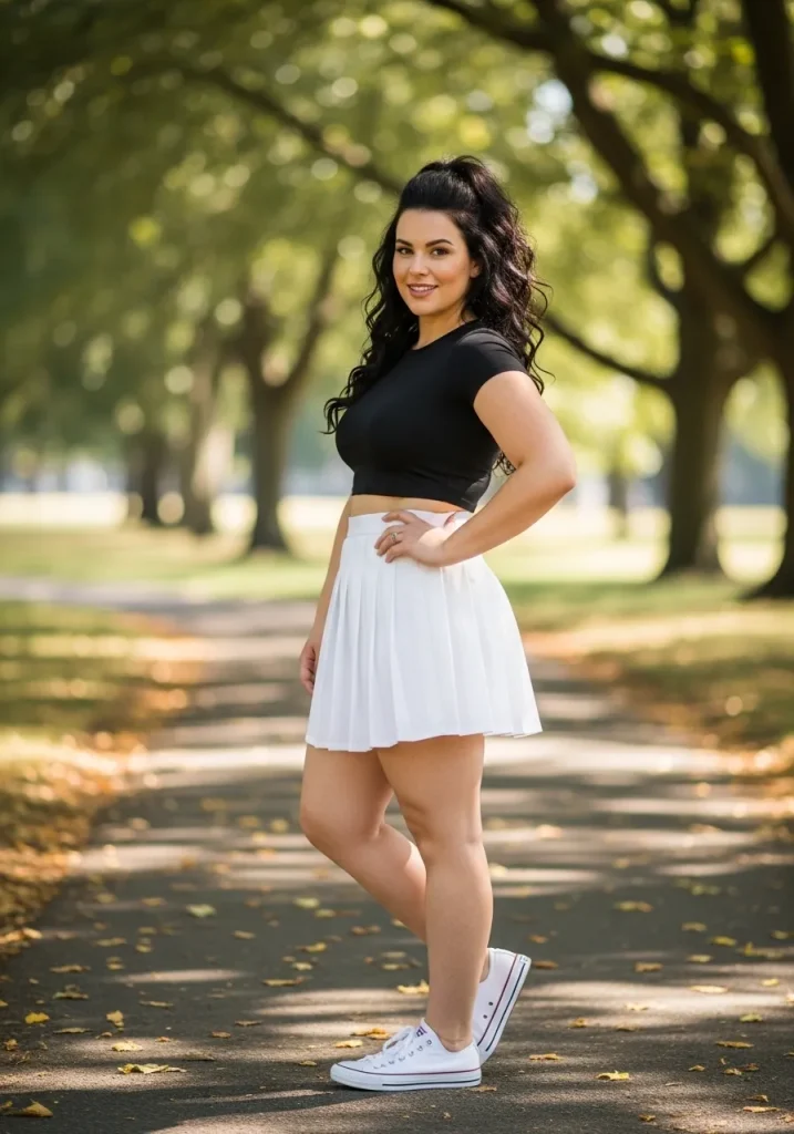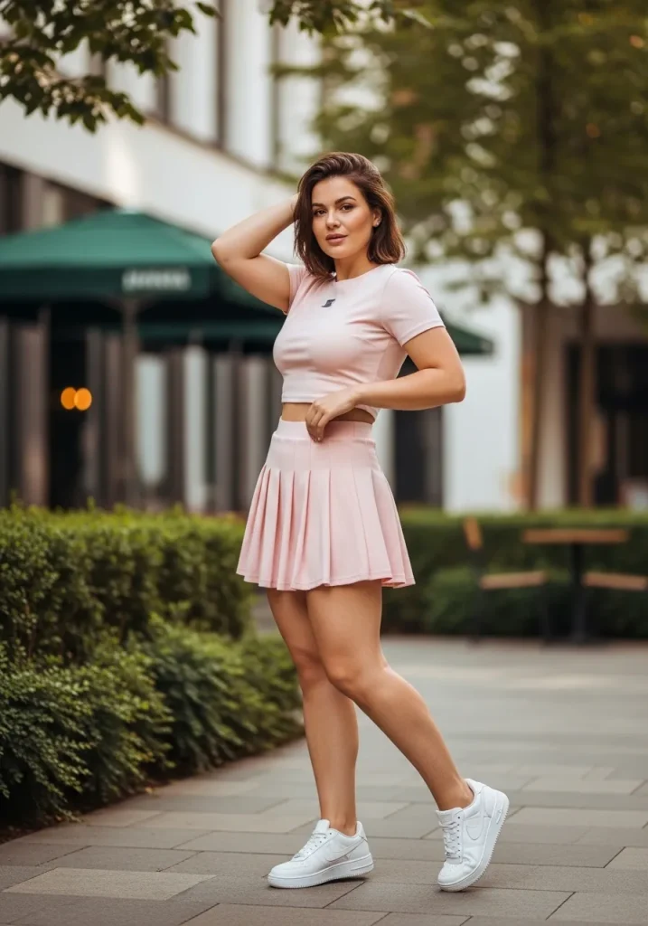 A pleated tennis skirt styled with a crop top creates a youthful and trendy outfit that feels perfect for warm days. The cropped silhouette highlights the waist while the pleated skirt adds movement and texture.