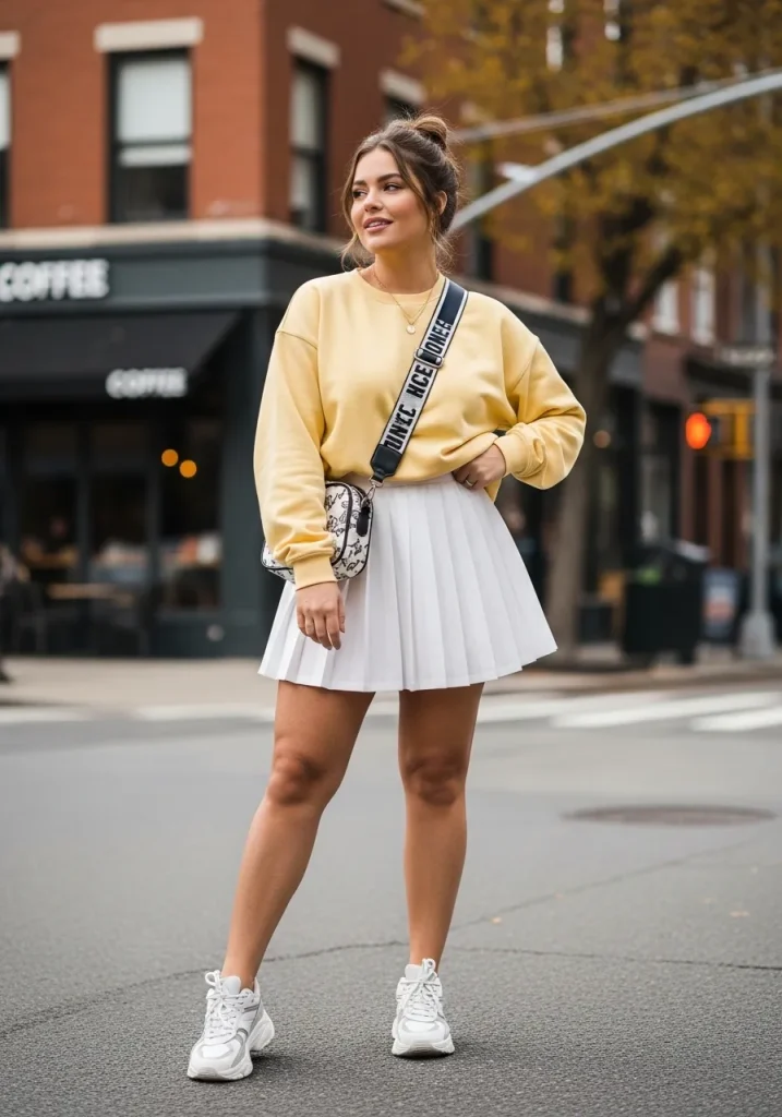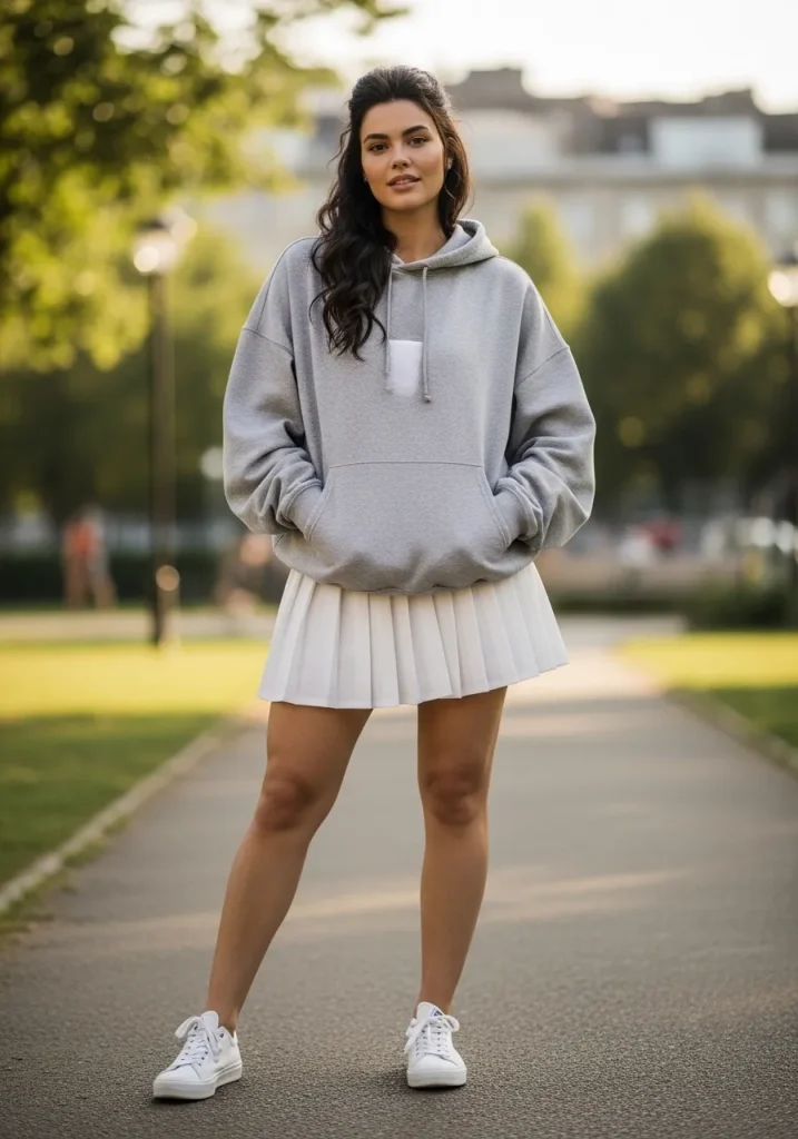 Pairing a tennis skirt with an oversized sweatshirt creates a cozy yet trendy outfit that feels effortlessly cool. The oversized fit contrasts beautifully with the short structured skirt, creating a balanced silhouette that looks relaxed but stylish.