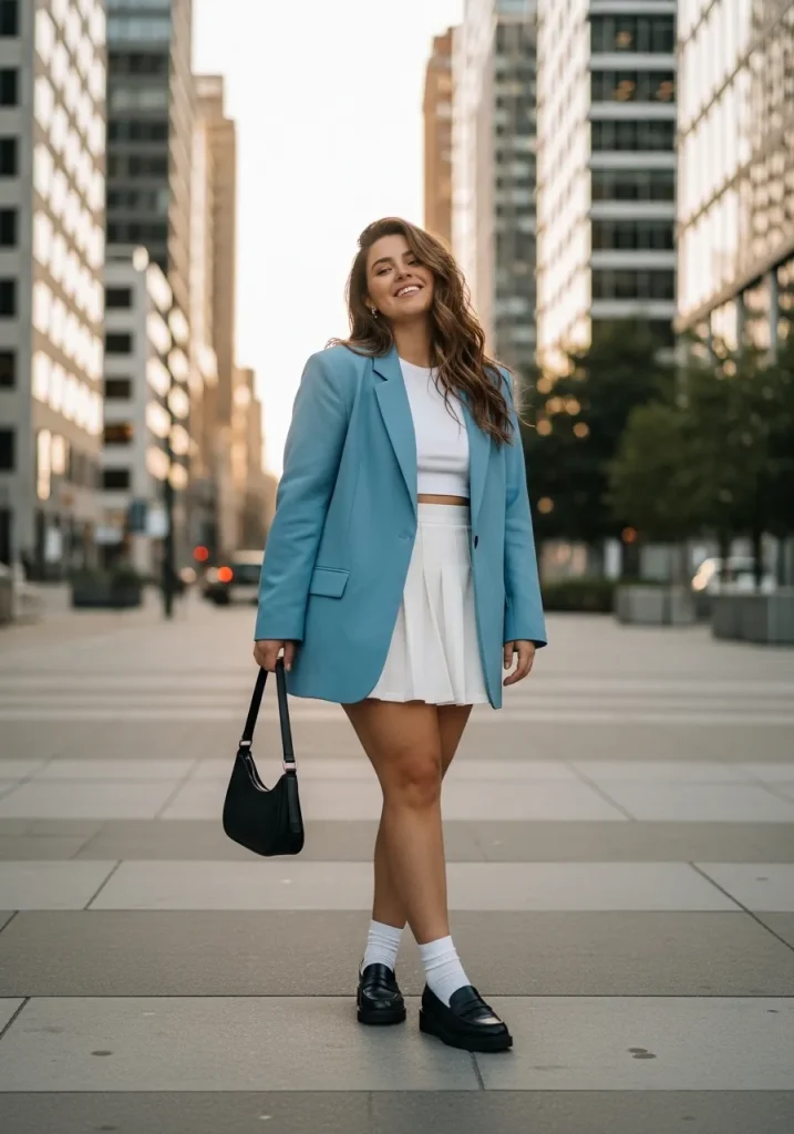 Pairing a tennis skirt with a blazer creates a chic and elevated outfit that blends sporty and sophisticated elements. The structured blazer adds polish while the skirt keeps the look playful.