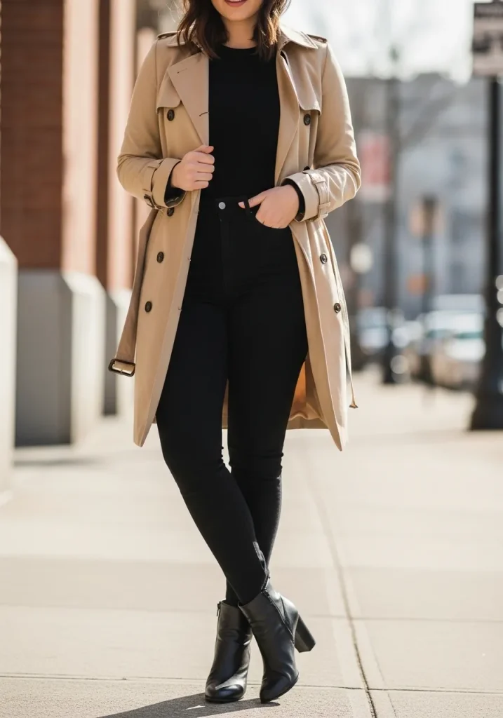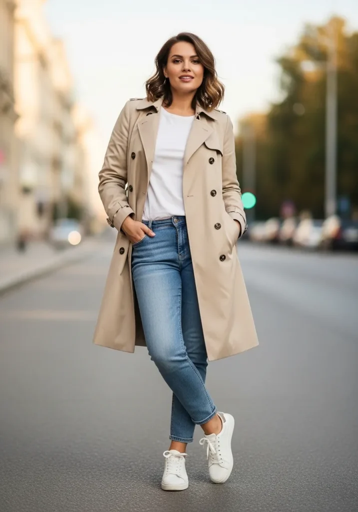 A classic beige trench coat paired with jeans creates a timeless outfit that feels effortlessly polished. The neutral tone of the trench makes it easy to style while adding structure to a casual denim look. This combination is perfect for everyday wear because it feels comfortable yet elevated. It’s one of the most reliable ways to look put together without overthinking your outfit. The overall vibe is clean, classic, and chic.