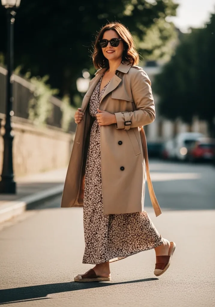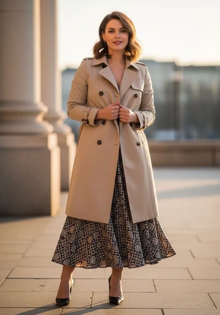 You can pair this look with flats, sandals, or boots depending on the season. Adding a crossbody bag keeps the outfit functional. Lightweight fabrics help maintain comfort throughout the day. Neutral or floral prints work beautifully with trench coats. This outfit is perfect for daytime outings or travel.