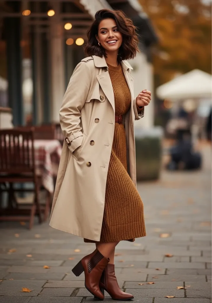 A trench coat paired with a knit dress creates a cozy and elegant outfit that feels perfect for cooler weather. The knit dress adds warmth and softness, while the trench coat keeps the look structured. This combination is both comfortable and stylish. It feels effortless yet polished. The overall aesthetic is cozy chic.