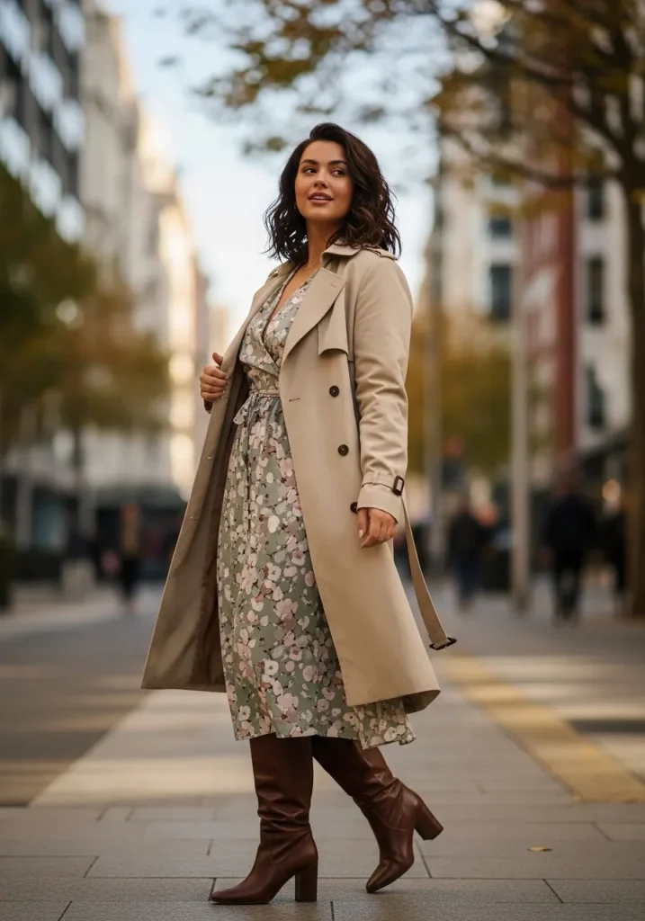 A trench coat paired with a midi dress creates a soft and elegant outfit that feels perfect for transitional weather. The flowy dress contrasts beautifully with the structured coat, creating a balanced look. This combination feels feminine while still being practical. It’s ideal for days when you want something comfortable yet stylish. The overall vibe is graceful and polished.