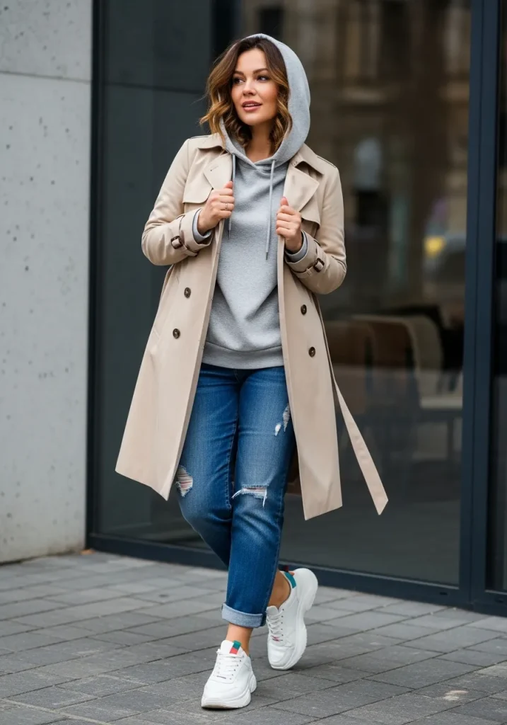 Layering a trench coat over a hoodie and jeans creates a trendy and comfortable outfit. The hoodie adds a casual, relaxed feel while the trench elevates the look. This combination is perfect for mixing comfort with style. It feels modern and very street-style inspired. The overall vibe is cool and effortless.