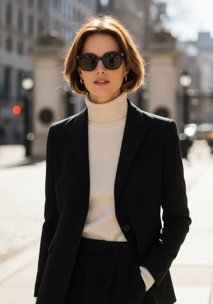 You can pair black trousers or jeans with a fitted black top to create a clean silhouette. Adding black boots or heels enhances the sleek vibe of the outfit. Minimal accessories like a structured bag or sunglasses complete the look beautifully. This outfit works well for both day and night. It’s a timeless choice that never fails.