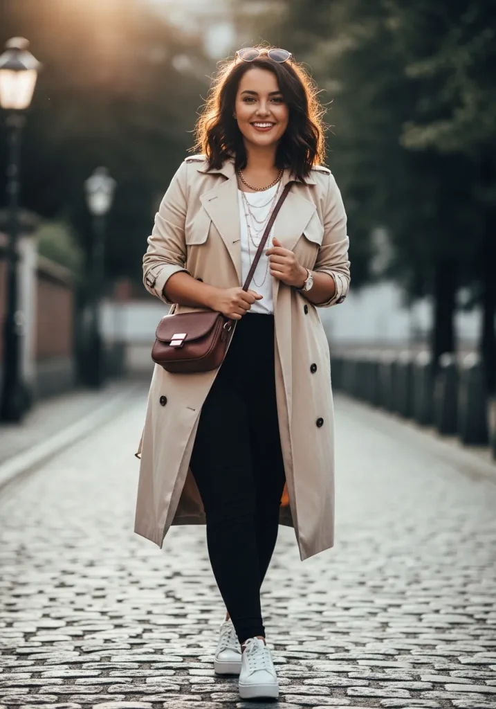 A trench coat paired with leggings and sneakers creates a comfortable yet stylish outfit. The leggings keep the look relaxed while the trench adds structure. This combination is perfect for busy days when comfort is key. It feels casual but still put together. The overall vibe is practical and chic.