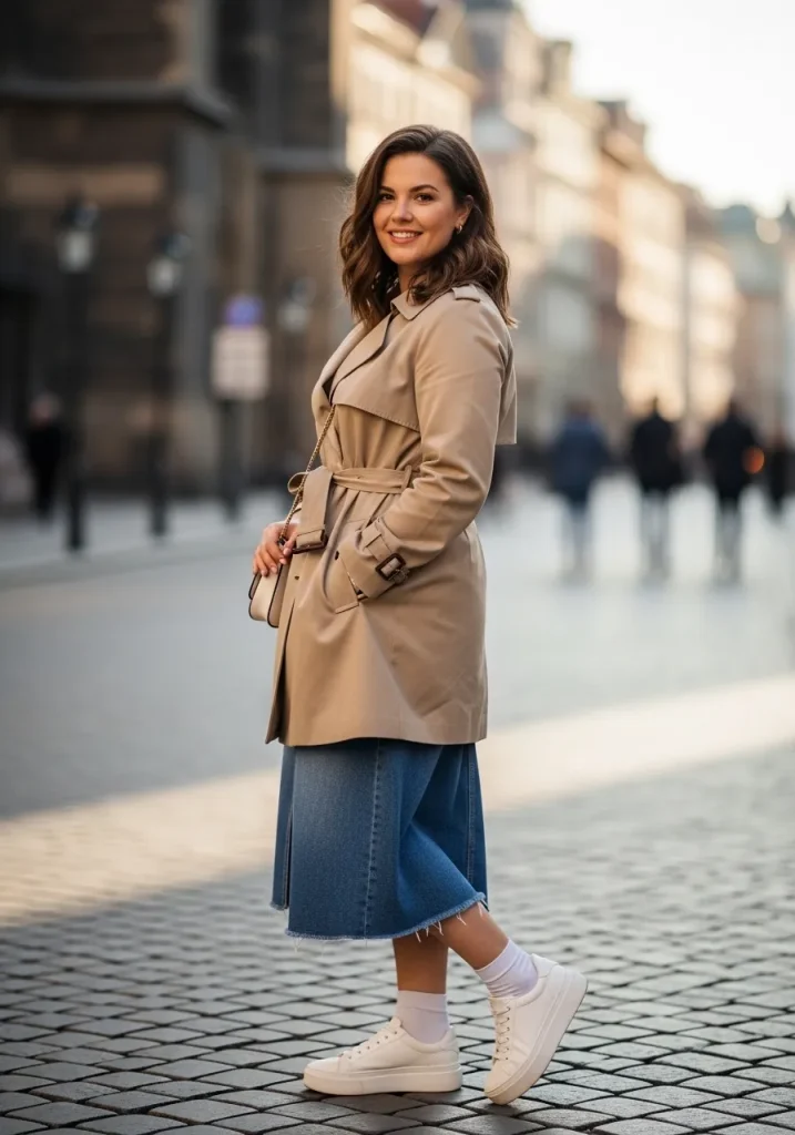 A trench coat styled with sneakers creates a relaxed and modern outfit that feels very wearable. The sneakers keep the look grounded and comfortable, while the trench coat adds a polished layer. This combination is perfect for everyday styling. It feels effortless and easy to recreate. The overall vibe is casual chic.