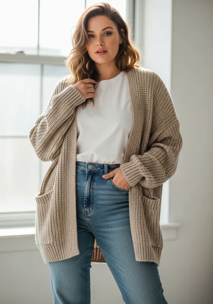 A neutral cardigan is perfect for layering and adding warmth without bulk. It’s a versatile piece that works across seasons and styles.