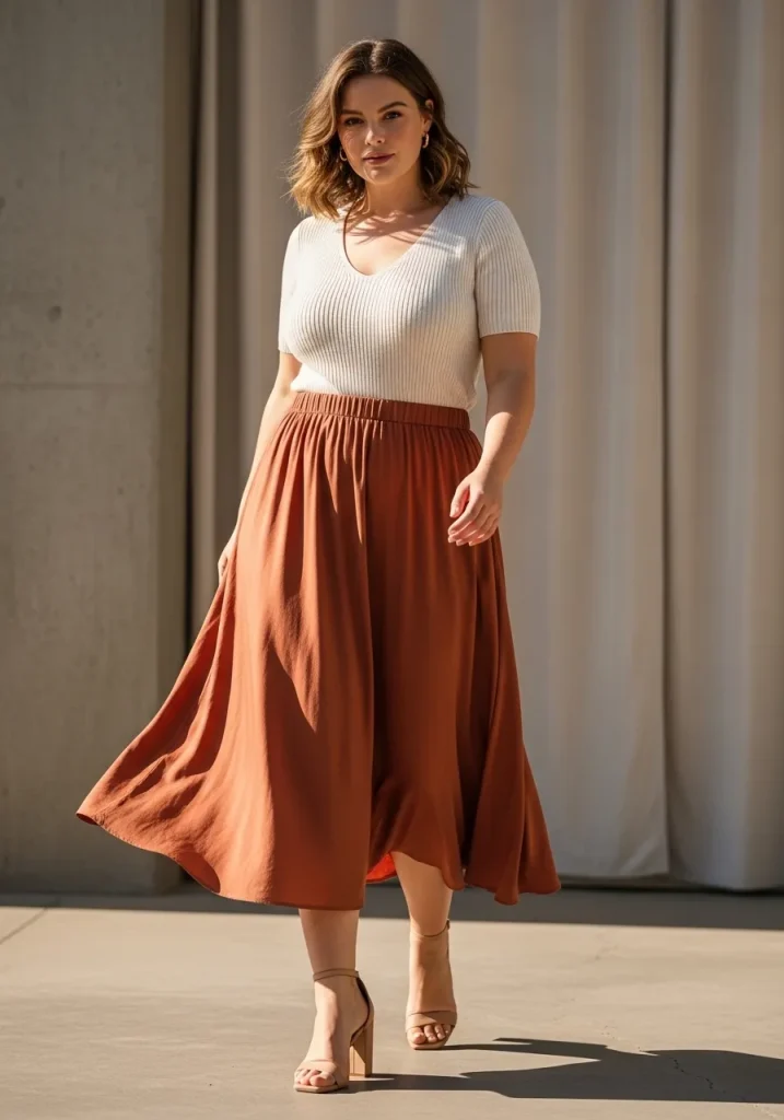 You can style it with a tucked-in blouse and heels for a sophisticated look or with a sweater and sneakers for something more relaxed. Flowy fabrics create movement and softness, while structured skirts give a more polished finish.