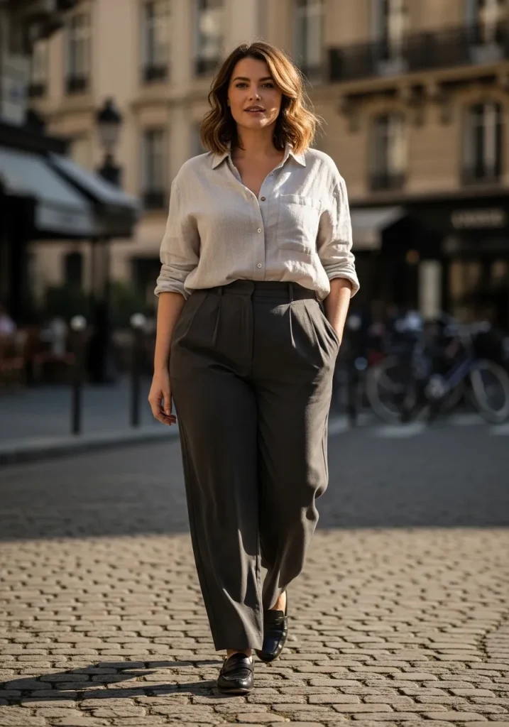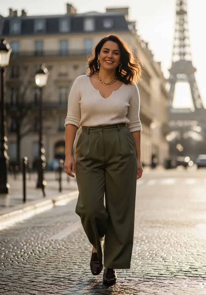 Choose high-waisted trousers in neutral tones like black, beige, or gray to keep the look sophisticated. Add minimal accessories, classic sunglasses, and loafers or heels. This look is clean, modern, and perfectly aligned with Parisian fashion.
