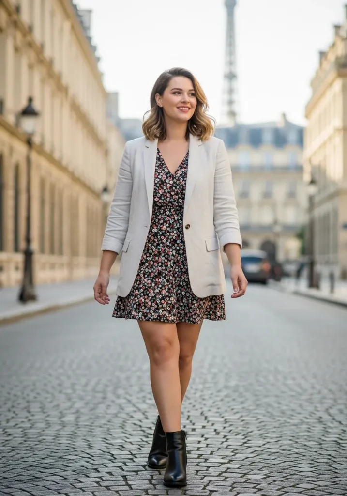 Choose neutral tones for the blazer and soft prints or solid colors for the dress. Pair with ankle boots or ballet flats and minimal accessories. This look is ideal for brunch, shopping, or casual city walks.
