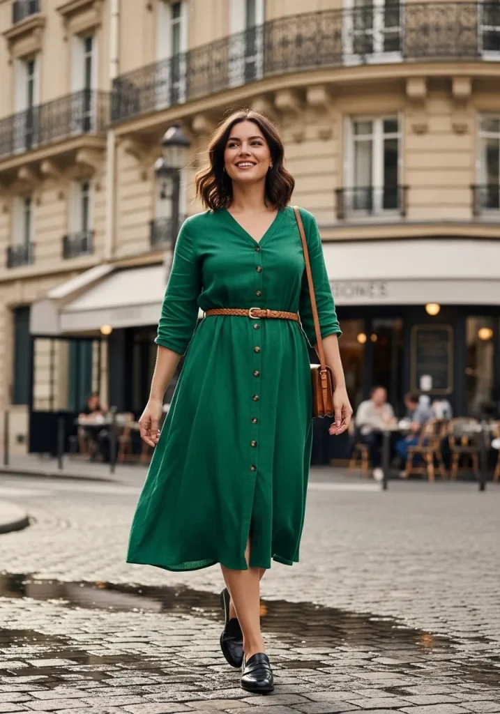 A button-front dress is both practical and stylish, making it a great choice for spring days in Paris. Adding a belt helps define your waist and gives the outfit a more polished and structured feel.