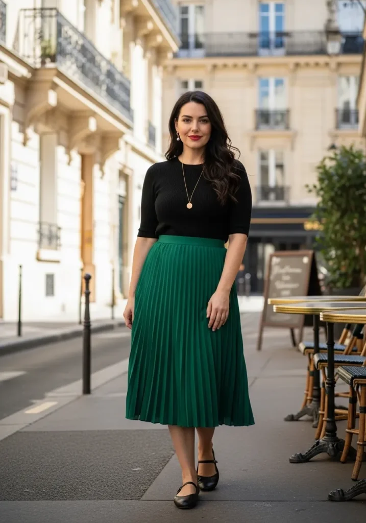 A pleated skirt paired with a fitted top creates a beautiful, balanced silhouette that feels feminine and elegant. This outfit is perfect for spring days when you want something light and flowy.