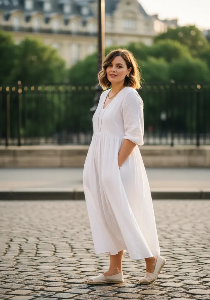 For a more relaxed Parisian look, pair a midi dress with classic white sneakers. This combination is comfortable yet stylish, perfect for sightseeing or casual outings.