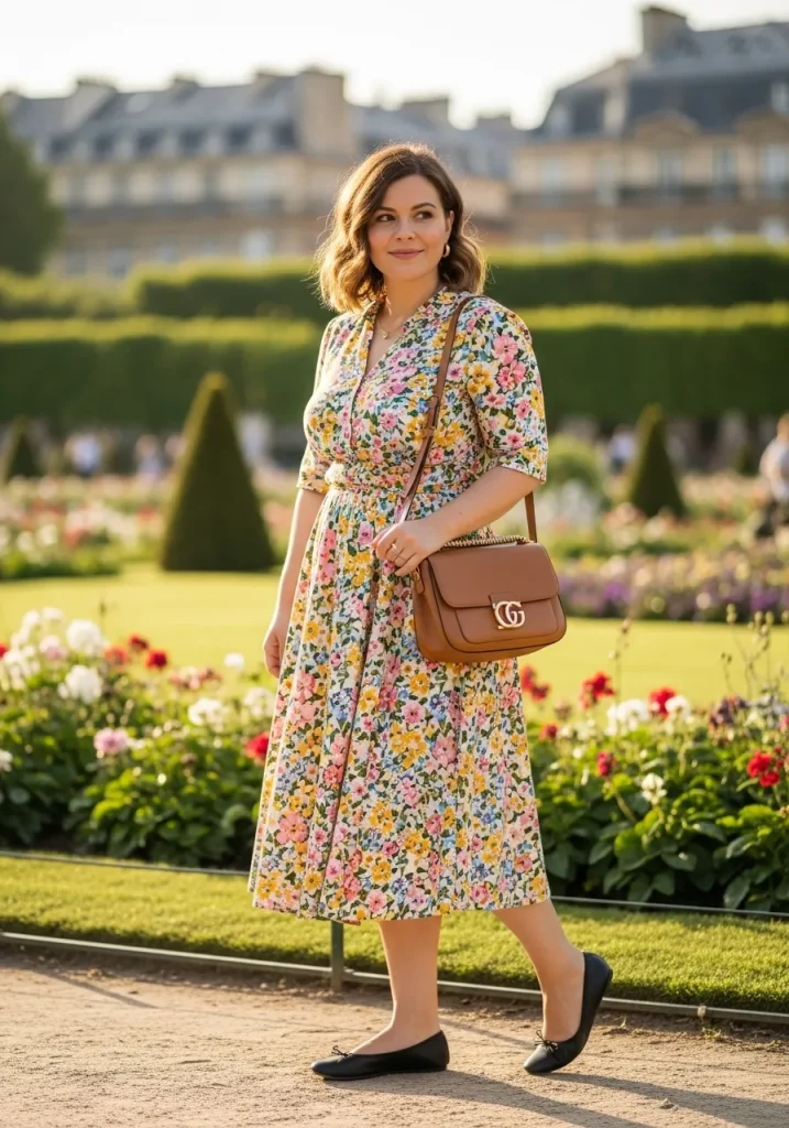 Spring in Paris is the perfect time to embrace soft, feminine pieces like a floral midi dress. This outfit feels romantic and light, making it ideal for strolling through gardens or enjoying a relaxed brunch.