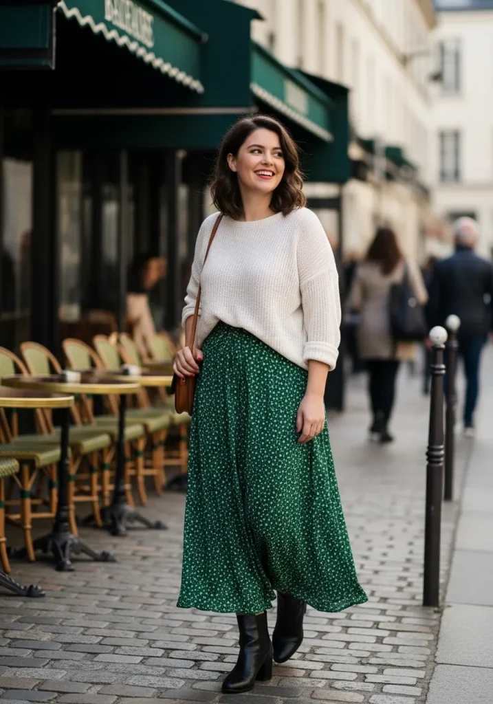 Choose neutral or pastel tones and keep the silhouette flowy and relaxed. Pair with ballet flats or ankle boots and a small bag. This outfit feels cozy yet chic and is perfect for both day and evening.