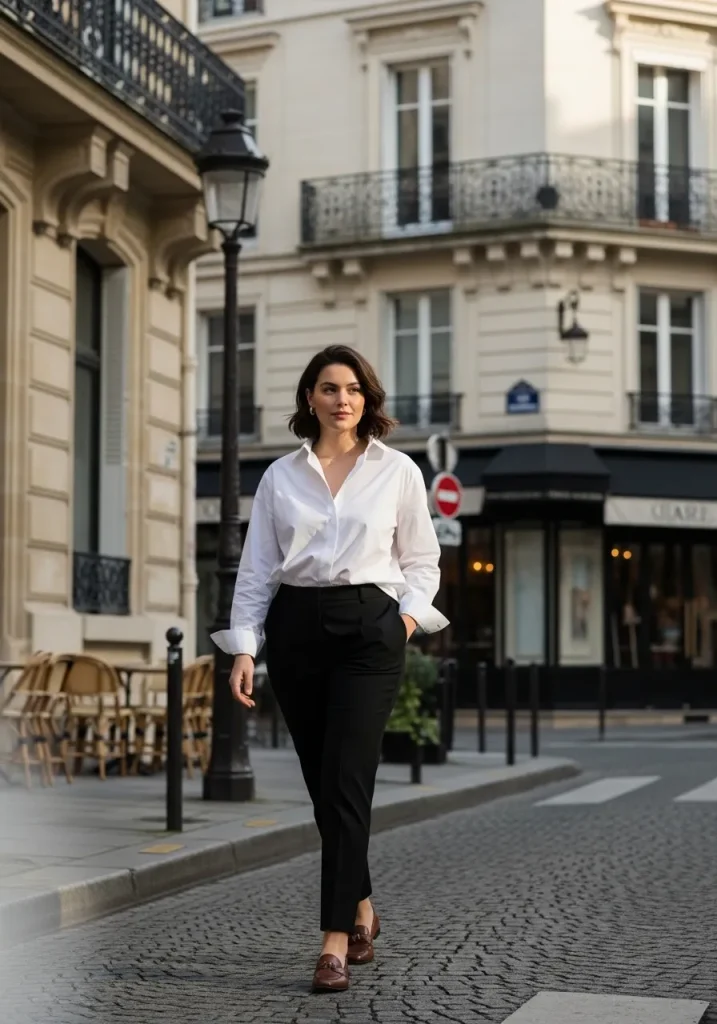 A crisp white shirt paired with tailored pants creates a clean and sophisticated outfit that feels very Parisian. It’s simple yet powerful, perfect for days when you want to look polished with minimal effort.