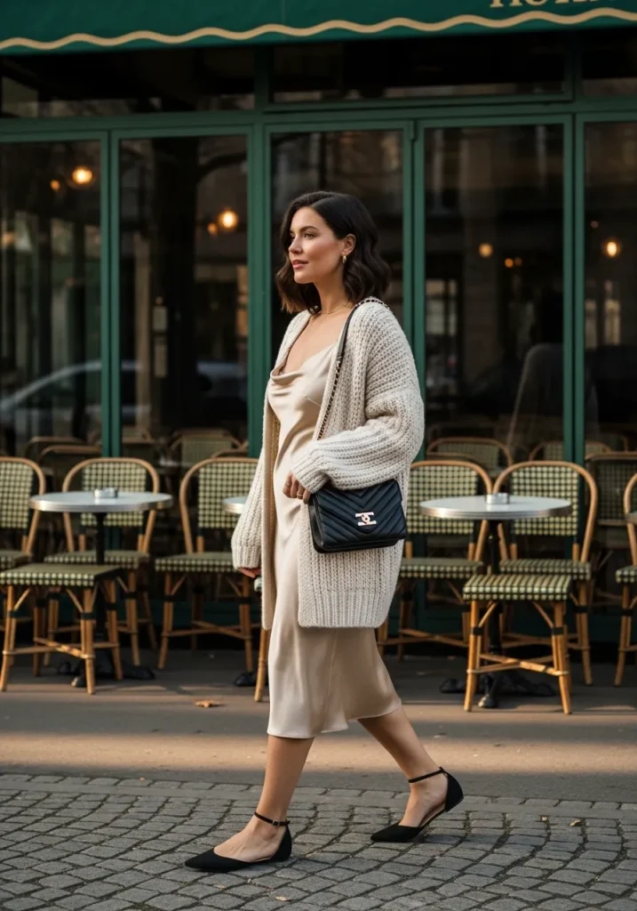 Layering a cardigan over a slip dress creates a soft, romantic look that’s perfect for spring. It adds warmth while still keeping the outfit light and feminine.