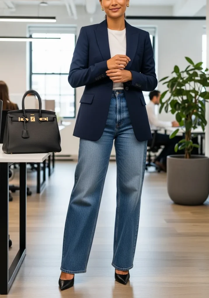 Pair the look with pointed-toe heels or chic loafers to keep things elegant. A structured handbag or briefcase will complement the business-ready vibe. This outfit is perfect for a smart-casual office setting or even a business lunch.