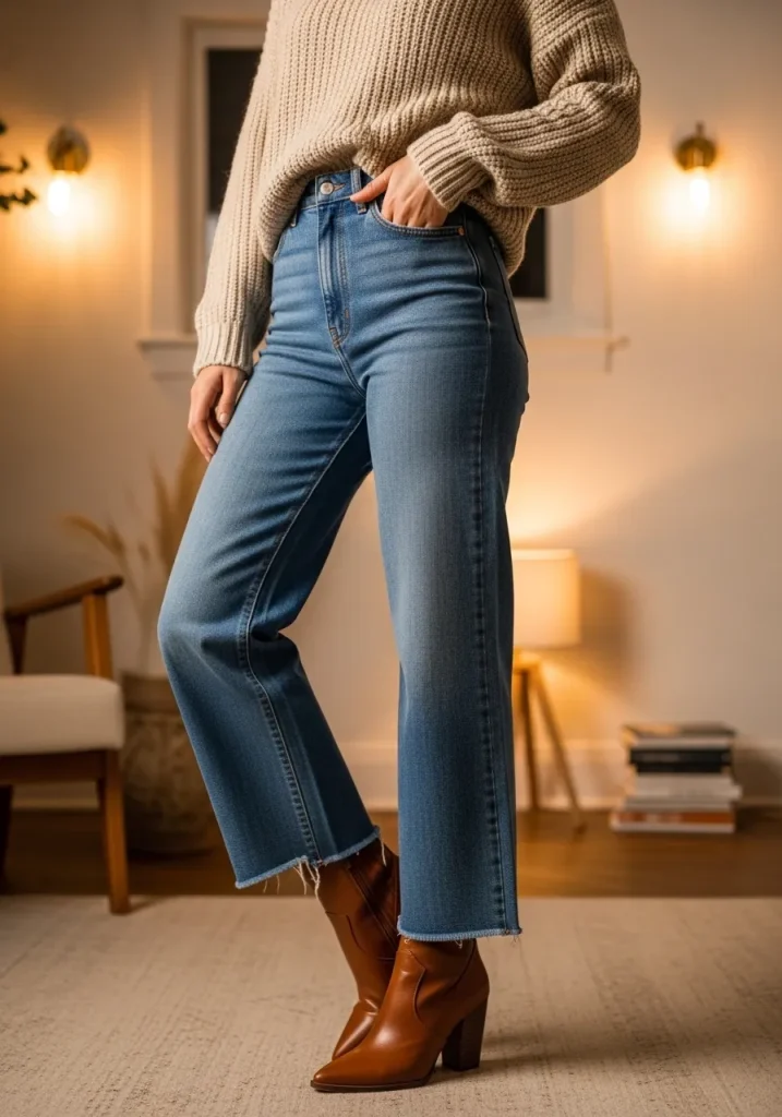 A V-neck sweater offers a sophisticated yet comfortable look when paired with wide-leg jeans. The open neckline creates a flattering shape, while the wide-leg jeans add balance. Opt for a fitted sweater or a slightly oversized one for a more relaxed look.