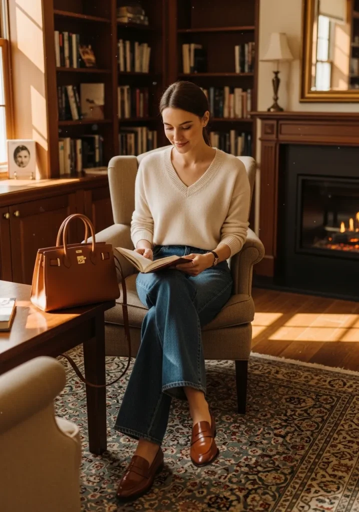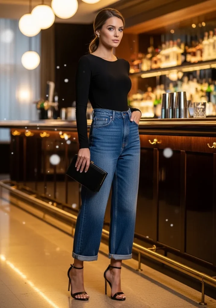 Heeled sandals or classic pumps work best with this outfit, adding sophistication without taking away from the relaxed vibe of the jeans. This outfit is perfect for evening dinners, cocktail parties, or a date night.