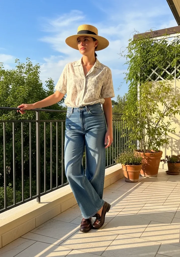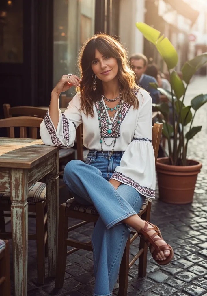 Channel your inner boho chic with wide-leg jeans paired with a flowy, billowy blouse. This combination offers an effortless, free-spirited look that’s perfect for casual outings or summer festivals. Opt for a blouse in earthy tones like terracotta, olive, or mustard, and complete the look with a floppy hat for extra flair.