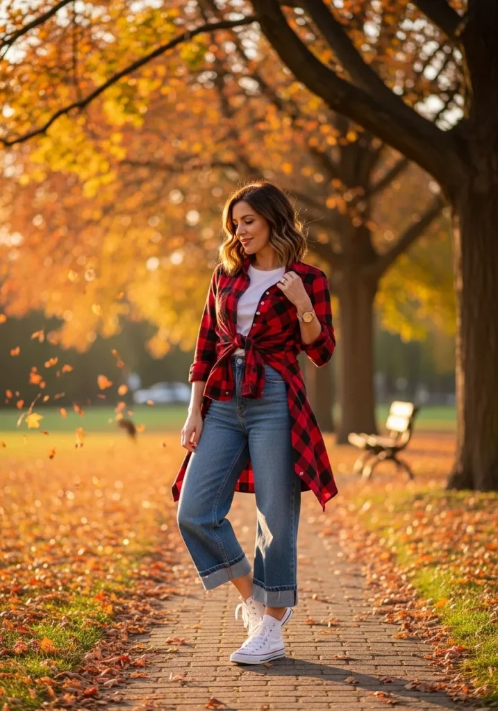 A flannel shirt adds a touch of casual comfort to wide-leg jeans, making this look perfect for weekend adventures or fall activities. You can tie the flannel shirt around your waist for a relaxed vibe or wear it open as a layering piece over a simple t-shirt.
