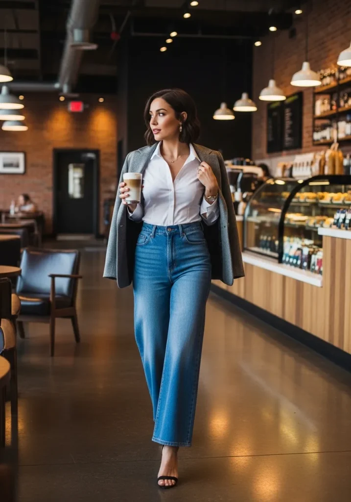 For a smart-casual look, tuck a crisp button-down shirt into high-waisted wide-leg jeans. This polished yet comfortable outfit is perfect for office wear or lunch dates. The key to pulling off this look is to ensure the shirt is tucked in neatly, and the jeans fit just right at the waist for an elongated silhouette.