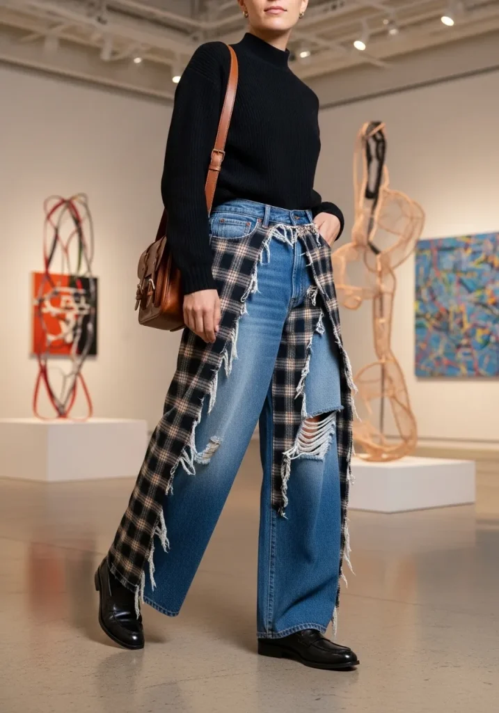 Plaid pants paired with wide-leg jeans offer a creative, edgy take on the wide-leg trend. The bold pattern of the plaid creates a visually interesting outfit, while the wide-leg fit keeps the look grounded. This style is perfect for fashion-forward individuals who want to experiment with different prints and textures.