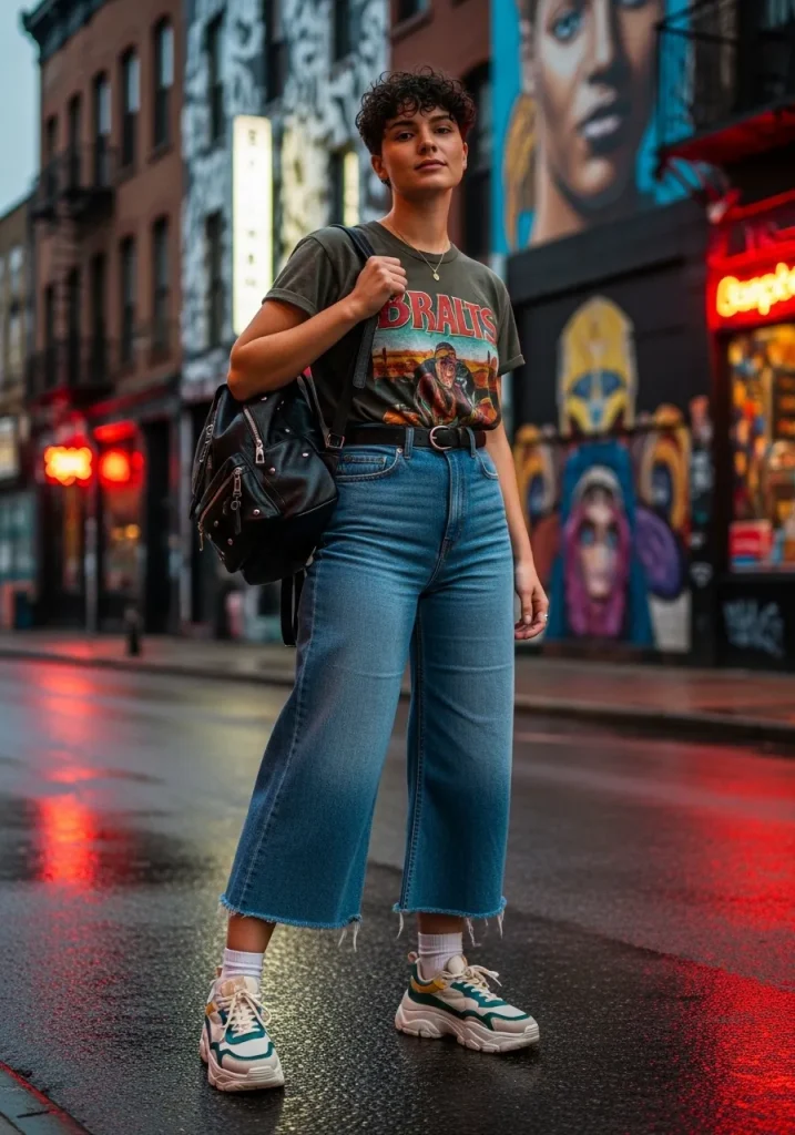 For a fun and laid-back look, pair your wide-leg jeans with a graphic tee that speaks to your personality. Whether you choose a band tee, a vintage graphic, or a motivational quote, this outfit is all about making a statement. The key to making this style work is to let the graphic tee stand out by keeping the rest of the look simple.